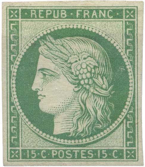 | Commentaire | Cérès - IIème République.1er tirage. Remplacé le 1er juillet 1853 par l'utilisation de timbres à 10 centimes couleur bistre (type président Louis-Napoléon) Voir la vidéo "Histoires de timbres" En savoir plus sur Wikipédia : Cérès Émis le 01 mars 1850 mais première utilisation connue le 29 juillet 1850, le 15 centimes au type Cérès complète les valeurs créées à la suite de la réforme postale instaurée par le décret du 24 août 1848 et mise en œuvre le 1er janvier 1849. Cette réforme distingue plusieurs catégories d’acheminement : tarif général « bureau à bureau », port local, port urbain et tarif spécifique de Paris. Le 15 c répond précisément à ce dernier cadre. Institué par la même loi du 15 mai 1850 que le 10 c bistre-jaune, il est destiné à l’affranchissement des lettres de Paris pour Paris jusqu’à 15 grammes, correspondant au tarif urbain spécifique de la capitale. Sa vente est exclusivement limitée aux bureaux parisiens, ce qui en fait une valeur strictement locale dans le réseau postal. Bien qu’émis pour un usage interne à Paris, le 15 c trouve également une application dans certains affranchissements internationaux. Il sert notamment à composer le port des courriers expédiés vers les États-Unis, lorsque l’acheminement s’effectue par la voie anglaise à partir du 1ᵉʳ décembre 1851, le prix étant alors un multiple de 1 franc 30. Inséré dans la première série Cérès non dentelée, portant l’allégorie républicaine de Jacques-Jean Barre, ce timbre illustre la complexité des tarifs parisiens et l’adaptation progressive du système postal aux besoins urbains et internationaux du début de la IIᵉ République. |