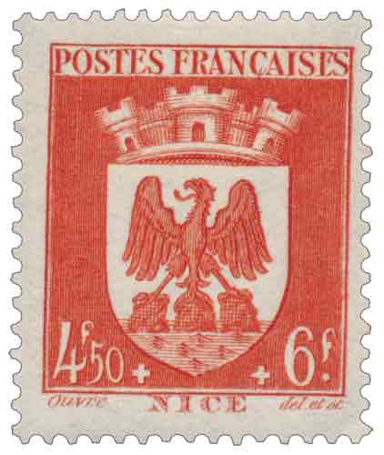 | Commentaire | Ce timbre gommé émis en 1942 appartient à la deuxième série des Armoiries des villes de France, série semi-postale associant la valorisation de l’héraldique urbaine à une contribution obligatoire au Secours National. Il représente les armoiries de Nice, figurant un mont à trois coupeaux surmonté d’une aigle couronnée aux ailes abaissées, emblème évoquant à la fois l’ancrage géographique et l’histoire politique de la cité. Dessiné et gravé par Achille Ouvré, le timbre est imprimé en taille-douce rotative, technique privilégiée pour cette série afin d’assurer une restitution précise des détails héraldiques dans un format réduit. La valeur faciale de 4,50 francs, assortie d’une surtaxe de 6 francs, correspond à des usages postaux très spécifiques, notamment l’affranchissement de paquets lourds destinés aux militaires, ce qui explique son positionnement parmi les valeurs les plus élevées de l’émission d’octobre 1942 et sa diffusion volontairement limitée. |