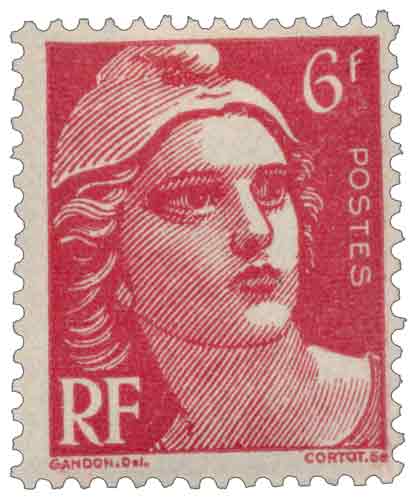 | Commentaire | Le timbre gommé de 1946 « Marianne de Gandon » à 6 francs orange-rouge appartient à la série définitive qui accompagne l’ajustement progressif des tarifs postaux dans la France de l’après-guerre. Mis en vente le 11 avril 1946, il répond initialement au tarif de la carte postale pour l’étranger, avant de voir son usage évoluer à compter du 1ᵉʳ mars 1947 pour l’affranchissement des lettres de 20 à 50 grammes pour l’intérieur, illustrant la souplesse d’emploi caractéristique de certaines valeurs de cette série. La représentation de Marianne, figure centrale de la symbolique républicaine, s’inscrit dans la volonté de continuité institutionnelle et de normalisation des services publics après la Libération. Le dessin de Pierre Gandon, gravé par Henri Cortot, est imprimé en typographie rotative, procédé bien adapté à une diffusion régulière sur plusieurs années, comme le confirme une durée de commercialisation prolongée jusqu’en 1949. |