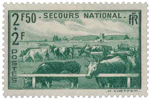 | Commentaire | Secours National - Élevage. Émis le 2 décembre 1940 au profit du Secours National, organisme réactivé en 1939 pour assister les victimes de guerre dans un contexte de restrictions alimentaires et placé sous l'égide du régime de Vichy, ce timbre semi-postal de valeur faciale 2,50 francs plus surtaxe de 2 francs correspondant au tarif de la lettre simple pour l'étranger représente une scène d'élevage bovin soulignant le rôle essentiel de l'agriculture animale en période de crise. Dessiné et gravé par Henry Cheffer, il est imprimé en taille-douce rotative en vert sur feuilles de 25 exemplaires, avec dentelure 13 et format de 36 × 21,45 mm pour la vignette, clôturant une série de quatre valeurs thématiques sur les travaux ruraux retirée de la vente le 16 août 1941. |