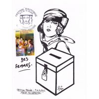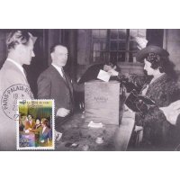 | Commentaire | Émis uniquement en feuillet Visuel : "Les femmes sont électrices et éligibles dans les mêmes conditions que l'homme". Le 21 avril 1944, alors que la France n'est pas encore libérée, une ordonnance publiée depuis Alger par le général de Gaulle accorde le droit de vote aux femmes, avec un siècle de retard sur les hommes. Les Françaises peuvent enfin voter pour la première fois le 29 avril 1945, lors des élections municipales. Voir la vidéo "Histoires de timbres" |