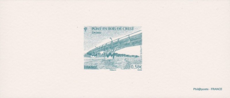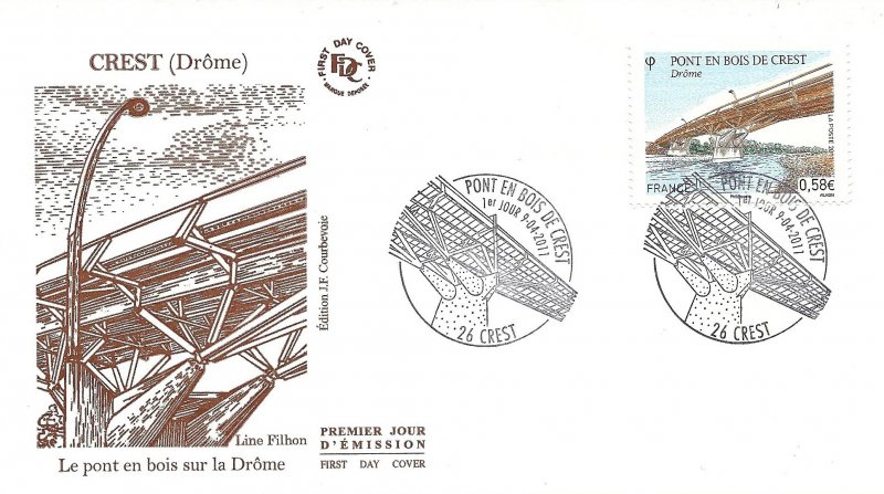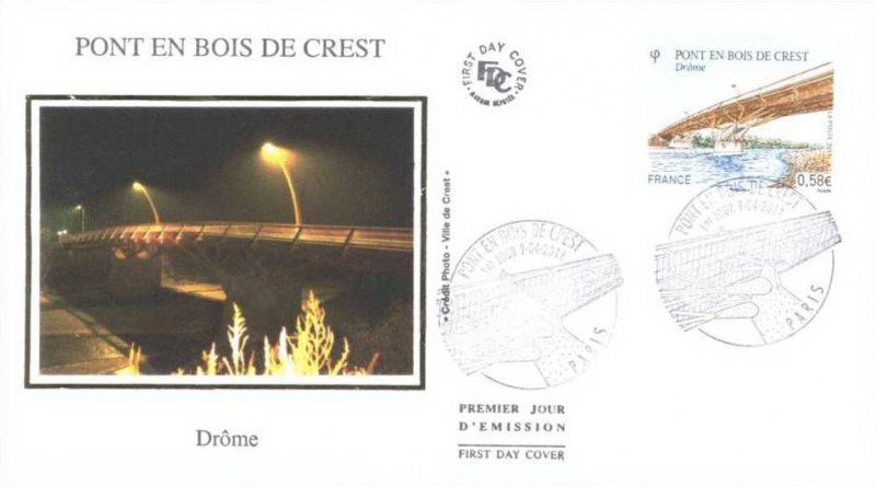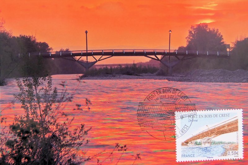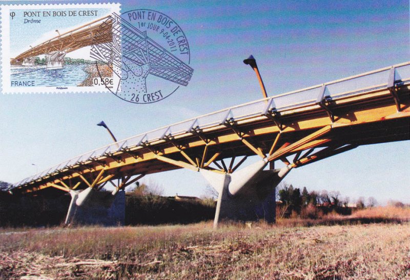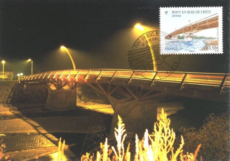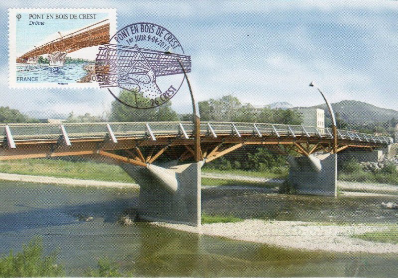 | Commentaire | Avec plus de 100 mètres de portée, ce pont sur La Drôme est Le plus Long pont en bois de France. Plutôt que de Louer un pont métallique provisoire, La ville de Crest a choisi de réaliser un ouvrage pérenne, innovant et respectueux de L'environnement. Il donne priorité aux essences de bois Locales, ressource naturelle de La région, et participe au développement touristique de La commune