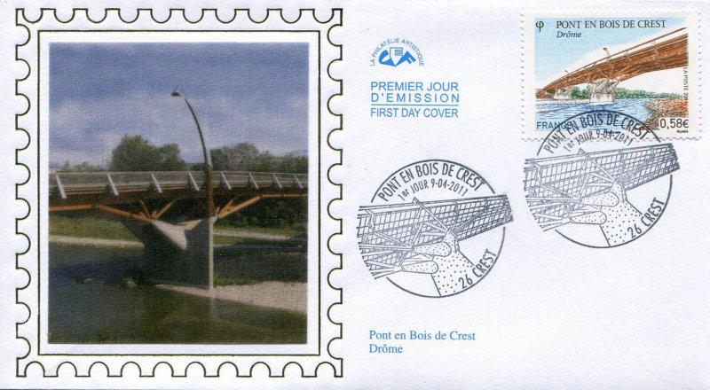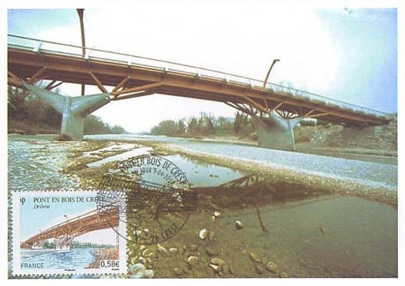 | Description | Pont en Bois de Crest (Drôme), ouvrage routier de 100 mètres de portée à double sens et à deux voies |