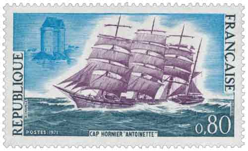 | Commentaire | Le timbre-poste français émis en 1971 consacré au cap-hornier L’Antoinette prolonge la série des grands voiliers engagée l’année précédente et s’inscrit dans une démarche de mise en valeur du patrimoine maritime national à travers la philatélie. Mis en vente générale le 13 avril 1971 après une vente anticipée le 10 avril à Saint-Malo, ce timbre de 0,80 franc est destiné à l’affranchissement de la lettre simple pour l’étranger, usage cohérent avec un sujet évoquant le long cours et les échanges intercontinentaux. La figurine représente un voilier de commerce de la grande époque de la marine à voile française, période comprise entre la fin du XIXᵉ siècle et le début du XXᵉ, lorsque l’industrie et l’agriculture européennes dépendaient encore largement des routes maritimes pour l’acheminement du nitrate chilien, des minerais du Pacifique ou des céréales d’Australie et d’Argentine. L’Antoinette, quatre-mâts barque construit à la fin du XIXᵉ siècle, symbolise cette flotte moderne à coque d’acier, dotée d’une mâture métallique et conçue pour affronter les navigations les plus éprouvantes, notamment le passage du cap Horn, redouté pour ses vents d’ouest violents, ses mers croisées et ses conditions climatiques extrêmes. Le timbre évoque ainsi une époque où le titre de cap-hornier constituait une forme de noblesse maritime, acquise au prix d’une solidarité sans faille entre hommes confrontés aux éléments. La présence, en arrière-plan de la composition, de la tour Solidor rappelle le rôle de Saint-Malo comme lieu de mémoire de ces marins du long cours, à travers le musée international qui leur est dédié. Dessiné par Roger Chapelet et gravé en taille-douce par Claude Durrens, le timbre se distingue par une composition équilibrée et une restitution précise de la silhouette du voilier sous voiles, traduisant à la fois la puissance et l’élégance de ces grands bâtiments marchands. Cette émission de 1971 témoigne de la volonté de l’administration postale française de conserver la mémoire d’un monde maritime disparu, tout en faisant du timbre un support de transmission historique et culturelle. Article rédigé pour WikiTimbres |