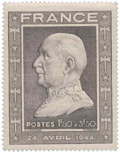 | Commentaire | Buste de Philippe Pétain, Maréchal de France (1856-1951) - 24 avril 1944. Démonétisé le :01/11/1944 Le timbre gommé émis en France en 1944 pour le 88ᵉ anniversaire du maréchal Pétain constitue une émission de propagande clairement identifiée, mise en circulation le 24 avril 1944 et destinée à l’affranchissement de la lettre simple pour le régime intérieur, assortie d’une surtaxe au profit du Secours National. Réalisé par Charles Mazelin d’après une médaille d’André Lavriller, ce timbre se distingue philatéliquement par son grand format, inédit dans l’histoire postale française au moment de son émission, et par son impression en taille-douce rotative, technique valorisant le modelé de l’effigie. Il s’inscrit dans la continuité des émissions à l’effigie de Philippe Pétain produites sous le régime de Vichy, alors que la situation militaire et politique de la France occupée est déjà très dégradée au printemps 1944. Son usage postal fut limité dans le temps, le retrait intervenant dès l’été 1944, avant sa démonétisation générale quelques mois plus tard, ce qui confère à ce timbre une place spécifique dans la philatélie française de la Seconde Guerre mondiale, à la fois par son format, sa fonction postale et son contexte historique. |