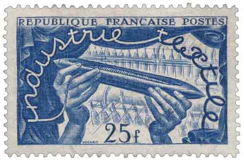 | Commentaire | Émis par la France en avril 1951, ce timbre gommé consacré à l’industrie textile s’inscrit dans les émissions thématiques valorisant les grands secteurs économiques nationaux au lendemain de la Seconde Guerre mondiale. Mis en vente à partir du 9 avril 1951, il met en image, sur un fond de broches de filatures, une navette de tissage, symbole central des techniques traditionnelles et industrielles du textile, illustrant l’alliance entre maîtrise technique et sens artistique qui caractérise cette industrie ancienne et complexe. Dessiné et gravé en taille douce par Albert Decaris, le timbre adopte un format horizontal et une dominante bleue qui soulignent la précision de la gravure et la lisibilité du motif. Sur le plan philatélique, sa valeur faciale élevée correspondait à un affranchissement spécifique, assurant un usage postal réel tout en conférant au timbre un caractère commémoratif affirmé. L’émission accompagne symboliquement l’Exposition textile internationale organisée à Lille au printemps 1951, manifestation marquant l’ouverture de l’industrie textile française à une concurrence mondiale accrue et son adaptation continue aux innovations techniques, des fibres naturelles aux fibres artificielles, dans la continuité d’une tradition qui faisait déjà la renommée des foires textiles européennes au Moyen Âge.