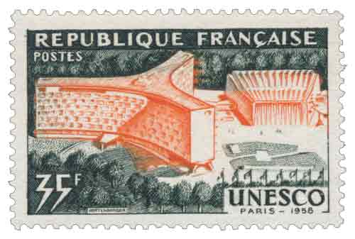 | Commentaire | L’émission du timbre de 35 francs consacré à l’inauguration du nouveau siège permanent de l’UNESCO à Paris s’inscrit pleinement dans le climat intellectuel et politique de la fin des années 1950, marqué par la volonté des États de consolider la paix par des instruments culturels et éducatifs plutôt que par la seule diplomatie militaire, alors même que la guerre froide structure durablement les relations internationales ; treize ans après sa création en 1945, l’UNESCO affirme sa maturité institutionnelle en s’installant dans un palais spécifiquement conçu pour elle au cœur de la capitale française, à proximité de l’École militaire, lieu hautement symbolique d’un basculement des logiques de puissance vers celles de coopération intellectuelle, tandis que l’architecture moderne du site, issue d’un travail collectif international, matérialise une organisation pensée comme transnationale dans sa conception autant que dans sa mission ; le timbre, par ses tonalités sombres et contrastées et par la représentation du bâtiment, ne se limite pas à illustrer une inauguration officielle, mais témoigne d’un moment où la culture devient un levier stratégique des relations internationales, la France cherchant à affirmer son rôle central dans les institutions multilatérales tout en promouvant une vision humaniste héritée des Lumières, fondée sur l’éducation, la circulation des savoirs et le dialogue des peuples comme conditions durables de la paix. |
