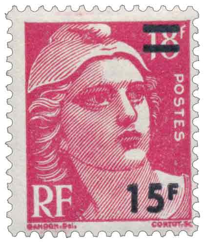 | Commentaire | Retrait en 1955 Émis en janvier 1954, le timbre Marianne de Gandon 15 F sur 18 F rose carminé s’inscrit dans la continuité de la série courante Marianne de Gandon, créée à la Libération et toujours en usage au début de la IVᵉ République. Cette figurine résulte d’une surcharge de valeur faciale appliquée sur le timbre de 18 F, afin d’adapter rapidement le stock existant à l’évolution des tarifs postaux sans engager une nouvelle impression complète. Le dessin, dû à Pierre Gandon, conserve l’allégorie classique de Marianne au profil serein, symbole de continuité républicaine, tandis que l’impression typographique et la gravure par Henri Cortot assurent une grande lisibilité malgré le petit format. La surcharge noire « 15 F », imprimée en typographie à plat, constitue l’élément distinctif de cette émission et en fait un exemple caractéristique des ajustements monétaires fréquents de l’après-guerre. Utilisé principalement pour l’affranchissement de la lettre simple pour le régime intérieur, ce timbre a circulé abondamment, illustrant le rôle central des Marianne surchargées dans la gestion quotidienne du courrier français au début des années 1950. |