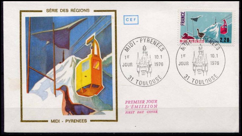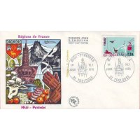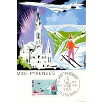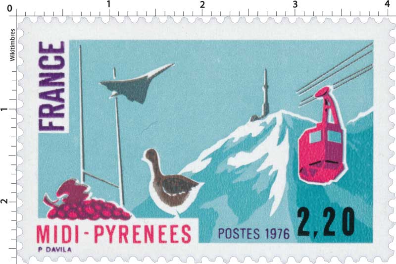 | Commentaire | Visuel : dans les Pyrénées, la neige et le ski, le Pic du Midi de Bigorre (2 876 m) avec son téléphérique, l'observatoire astronomique et le relais de télévision, les poteaux du fief de rugby, la gastronomie avec une oie, la vigne et ses grands crus, et son aérospatiale, avec un fleuron technologique, le Concorde. |