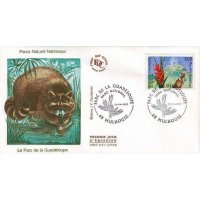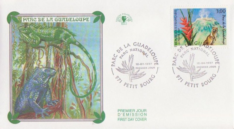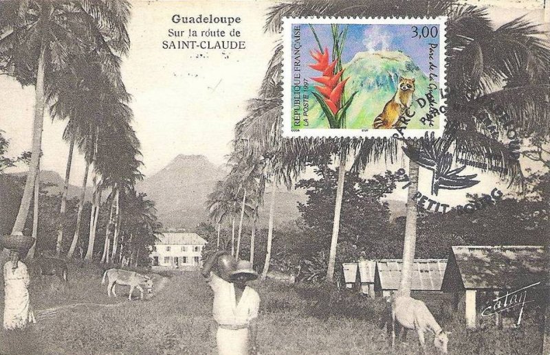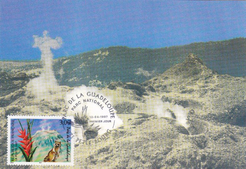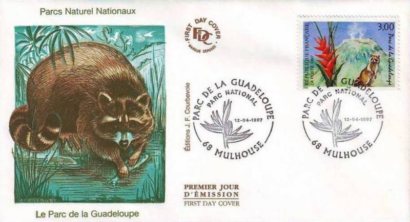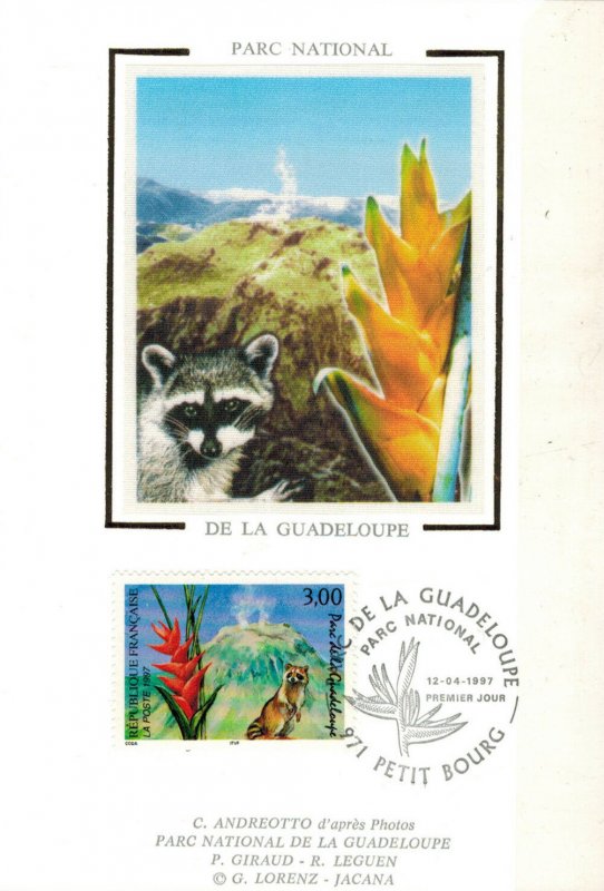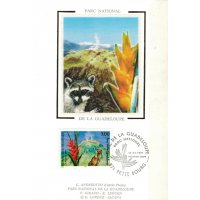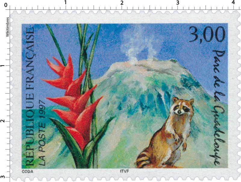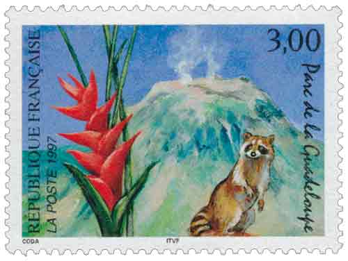 | Description | Parc de la Guadeloupe sur l'île de Basse-Terre, volcan de la Soufrière, fleur de balisier et racoon (raton laveur) |