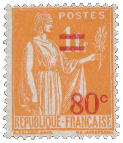 | Commentaire | Paix de Laurens. Type IIA. mis en novembre 1937, ce timbre est une variété significative du type courant dit "Type Paix de Laurens" (ou Type Laurens), initialement dessiné par Paul-Albert Laurens et gravé par Antonin Delzers. Il s'agit d'un timbre surchargé, caractérisé par l'impression de la nouvelle valeur faciale de 80 centimes sur un timbre préexistant d'une valeur supérieure (ici, 1 Franc orange, d'où la mention "80c sur 1F orange"). Cette pratique de surcharge, typique en philatélie, est souvent la réponse rapide de l'administration postale aux changements de tarifs. La valeur faciale de 80 centimes était celle nécessaire pour l'affranchissement de la carte postale pour le régime intérieur à l'époque. Imprimé en typographie, ce timbre vertical orange fait partie de la troisième série de ce type Paix. Il est un marqueur de l'instabilité tarifaire de l'époque et fut rapidement retiré le 16 novembre 1938, conférant une courte durée de vie à cette émission de nécessité. Les chiffres exacts du tirage et des ventes de ce surchargé restent malheureusement inconnus. |