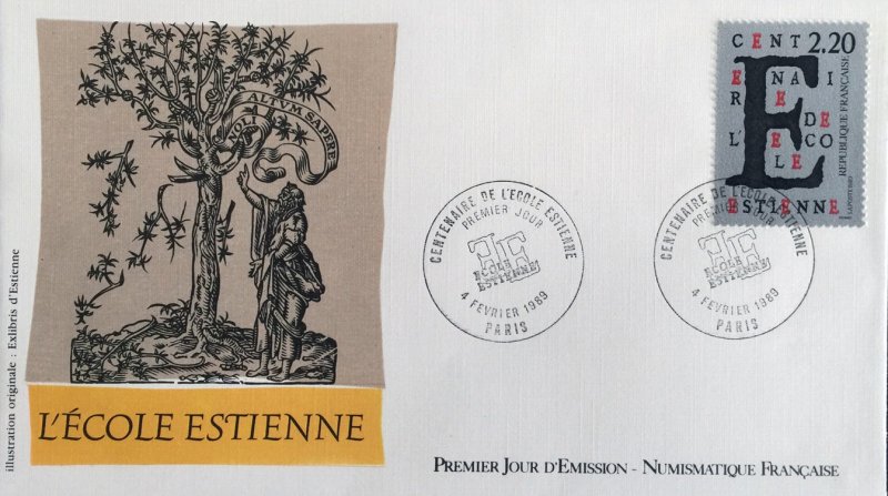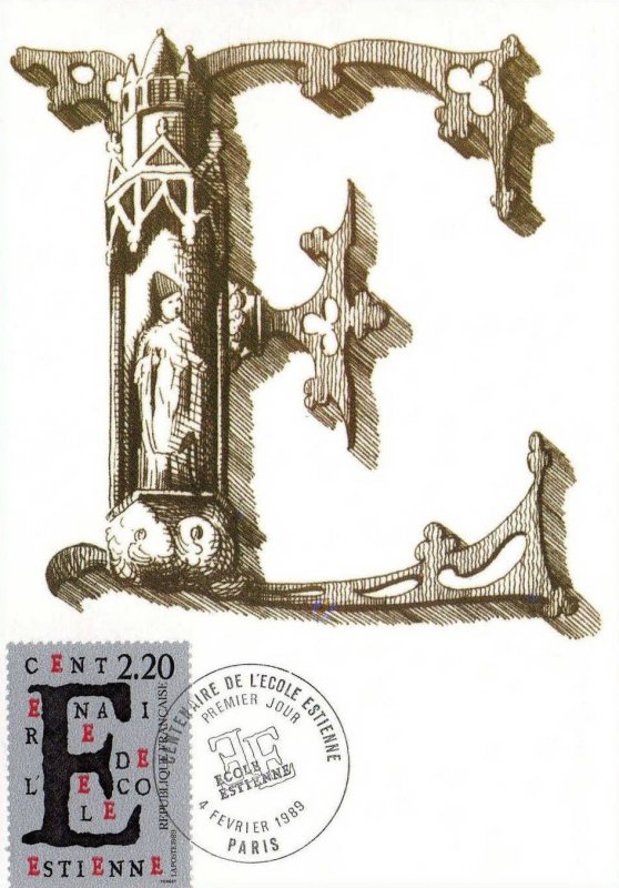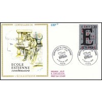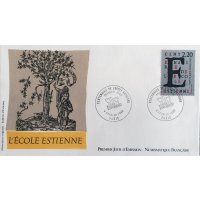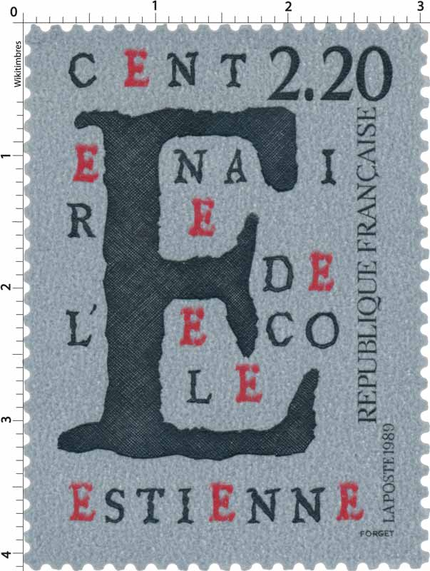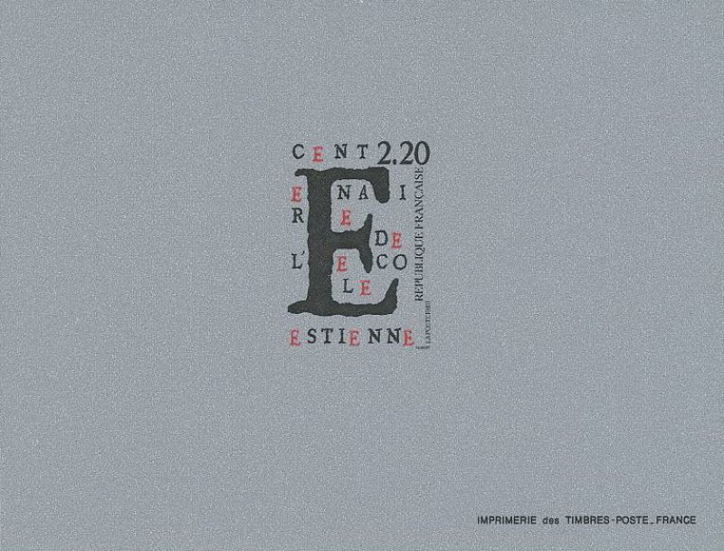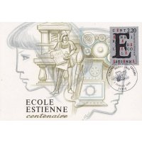 | Commentaire | Visuel et historique : création d'une élève de l'école Estienne - La famille Estienne, choisis comme patronyme de l'école, constituent à la Renaissance, une célèbre famille d'imprimeurs et d'érudits français. Du XVI e au XVIIIe siècle, plus de mille deux cents ouvrages sont sortis de leurs presses. Aujourd'hui l'école Estienne s'étend sur deux hectares et demi de planchers, comporte une biblio- thèque spécialisée de six mille volumes, et est équipée des matériels les plus performants et les plus modernes. D'école de métiers, l'établissement est devenu l'un des ensembles mondiaux les plus importants pour les enseignements appliqués à l'expression et à la communication graphique. |