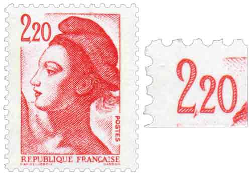 | Commentaire | Type II, se distingue du Type I par la virgule entre les deux 2 et par la barre inférieure des 2 de 2,20. Pour le type II, La barre inférieure du 1er 2 mesure 1,6 mm de long et a une épaisseur de 0,6 mm. La barre inférieure du 2ème 2 mesure 1,2 mm de long et a une épaisseur de 0,4 mm. Pour le type I : La barre inférieure du 1er 2 de 2,20 mesure 1,4 mm de long et a une épaisseur de 0,4 mm. La barre inférieure du 2ème 2 mesure 1,2 mm de long et a une épaisseur de 0,3 mm. Le type II a surtout été en vente dans les départements d'Amérique centrale, et dans quelques bureaux de poste en métropole. Le timbre au type II existe sur papier couché (Les bandes phospho sont très apparentes sur ce papier). Existe avec gomme mate ou tropicale. Existe sans bandes phosphorescentes accidentelles. |