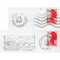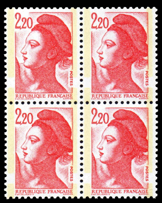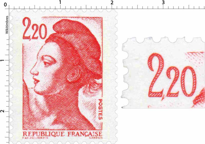 | Commentaire | Type II, se distingue du Type I par la virgule entre les deux 2 et par la barre inférieure des 2 de 2,20. Pour le type II, La barre inférieure du 1er 2 mesure 1,6 mm de long et a une épaisseur de 0,6 mm. La barre inférieure du 2ème 2 mesure 1,2 mm de long et a une épaisseur de 0,4 mm. Pour le type I : La barre inférieure du 1er 2 de 2,20 mesure 1,4 mm de long et a une épaisseur de 0,4 mm. La barre inférieure du 2ème 2 mesure 1,2 mm de long et a une épaisseur de 0,3 mm. Le type II a surtout été en vente dans les départements d'Amérique centrale, et dans quelques bureaux de poste en métropole. Le timbre au type II existe sur papier couché (Les bandes phospho sont très apparentes sur ce papier). Existe avec gomme mate ou tropicale. Existe sans bandes phosphorescentes accidentelles. |
