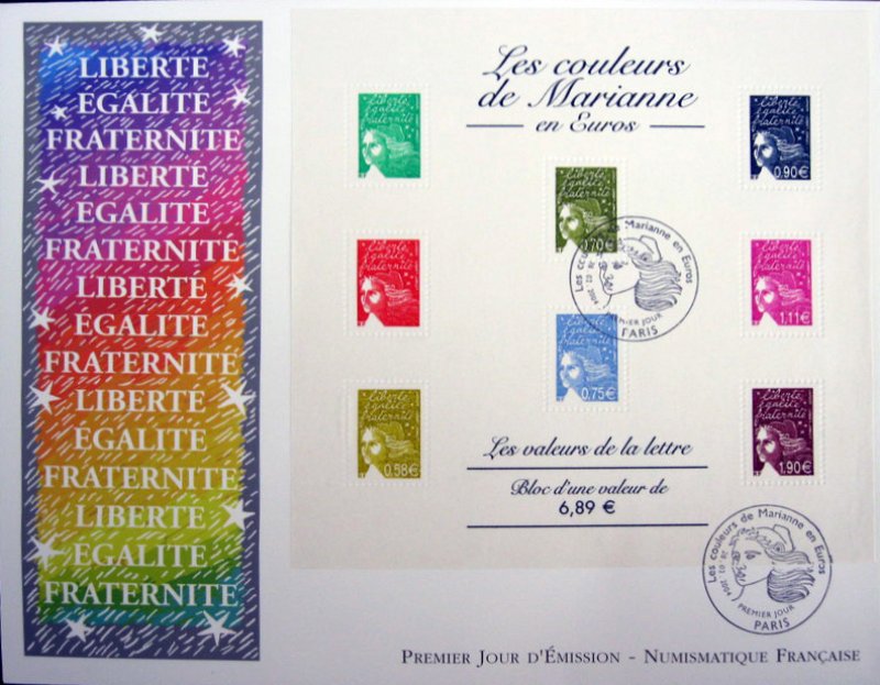 | Description | Les couleurs de Marianne en Euros. Les valeurs de la lettre. |