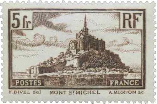 | Commentaire | Le Mont-Saint-Michel. Type II. Émis le 29 juin 1929, le timbre de 5 francs « Mont-Saint-Michel » s’inscrit dans la lignée des grands formats typographiés consacrés aux monuments emblématiques de France à la fin des années 1920. Gravé par Abel Mignon d’après un dessin de Fernand Bivel, il représente le Mont-Saint-Michel depuis la baie, dans une perspective mettant en valeur la silhouette ascendante de l’abbaye et la monumentalité du rocher. Imprimé en feuilles de 25, dentelé 13, ce timbre se distingue par sa teinte brun caractéristique, parfaitement adaptée au rendu des volumes architecturaux et aux contrastes puissants que permettait la typographie de l’époque. Il sera retiré de la vente en 1930, mais restera disponible dans certains bureaux jusqu’en 1937, ce qui explique la diversité des oblitérations rencontrées. Cette valeur figure parmi les premières émissions touristiques françaises d’envergure, annonçant la grande série des monuments lançée dans les années 1930. Très apprécié des collectionneurs thématiques (patrimoine, villes, architecture), le type offre par ailleurs de nombreuses nuances de tirage selon l’encrage et l’usure des plaques. |