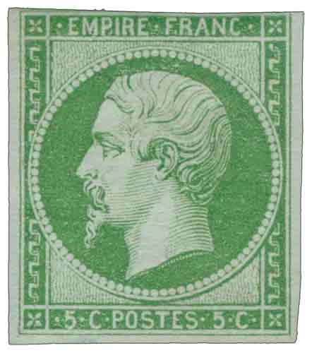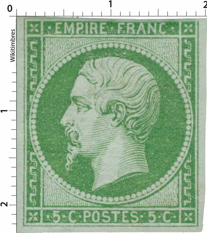 | Commentaire | Napoléon III. Légende : EMPIRE FRANC. Émis le 24 novembre 1854, le 5 centimes vert appartient aux premières émissions du type Napoléon III tête nue portant la légende « EMPIRE FRANC », adoptée après la décision de janvier 1853 remplaçant officiellement la légende « REPUB FRANC ». Jean-Jacques Barre réutilise le poinçon de la série « Présidence », mais en supprimant son initiale « B » sous le cou de l’effigie, modification caractéristique de la transition vers le régime impérial. Cette valeur répond directement à la réforme postale du 25 mai 1854, qui introduit une nouvelle échelle tarifaire. Le 5 centimes devient alors indispensable pour les petits affranchissements : faire-part, cartes de visite, imprimés légers et envois circulant à l’intérieur du même arrondissement postal. Son usage sur lettre standard reste exceptionnel, ce qui explique la fréquence élevée de documents philatéliques spécialisés et la relative rareté des usages postaux intéressants. Il s’inscrit dans une série en pleine recomposition : le 25 c et le 1 F, rapidement rendus inutiles par la baisse générale des tarifs, disparaissent dès 1854 au profit de nouvelles valeurs (20 c et 80 c). Le 5 c vert, au contraire, devient durablement un complément essentiel dans les combinaisons tarifaires. Imprimé en typographie, non dentelé, le timbre présente une teinte vert plus ou moins intense selon les tirages. Comme les autres émissions impériales précoces, il se rencontre en grande majorité avec l’oblitération losange Petits Chiffres, introduite progressivement à partir de 1852. |