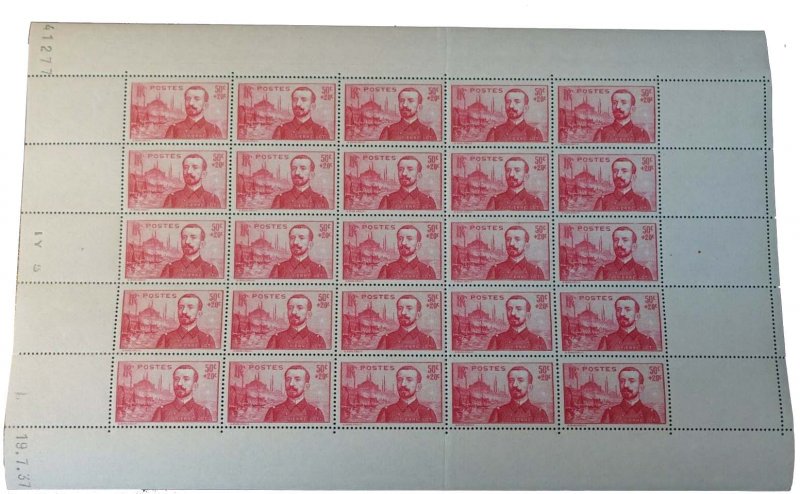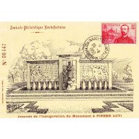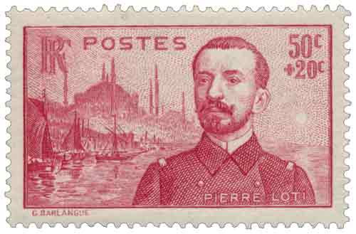 | Commentaire | Pierre Loti - Portrait et vue d'Istanbul. En savoir plus sur Wikipédia : Pierre Loti Émis le 16 août 1937 en taille-douce rotative, ce timbre horizontal carmin rose rend hommage à l'écrivain et académicien Pierre Loti (Julien Viaud, 1850–1923), figure emblématique de la littérature française. L'émission est caritative, comportant une surtaxe de 20 centimes destinée à financer le Monument Pierre Loti à Rochefort, sa ville natale. Dessiné et gravé par Gabriel-Antoine Barlangue, le timbre intègre en arrière-plan des éléments évocateurs de ses récits d'évasion, notamment Sainte-Sophie et le Bosphore à Istanbul (Turquie), pays qui inspira des œuvres comme Aziyadé. Avec une valeur faciale de 50 centimes, ce timbre couvrait à l'époque l'affranchissement des factures. Bien que 1,3 million d'exemplaires aient été émis, seuls 0,5 million ont été effectivement vendus, attestant d'une diffusion plus limitée que son tirage initial. Il fut retiré de la vente le 31 janvier 1938.