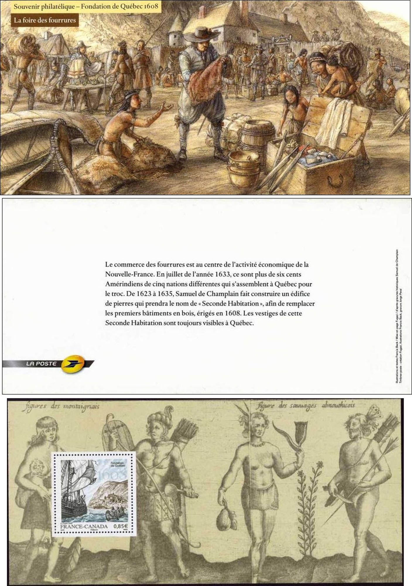 | Description | 400e anniversaire de la fondation de la ville de Québec. T.P. de même date imprimé sur feuillet de 205x95. Carte La Foire des fourrures |