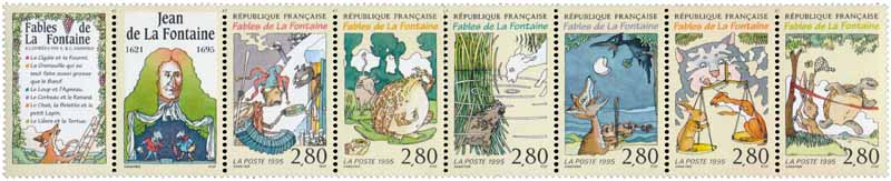 | Commentaire | Émis en feuilles (100.80 F) de 6 bandes de 6 TP Visuel : 2 vignettes : liste des Fables + Jean de La Fontaine (1621-1695, poète, fabuliste et romancier) + les 6 TP : La Cigale et la Fourmi / La grenouille qui se veut faire aussi grosse que le bœuf / Le loup et l'Agneau / Le corbeau et le renard / Le Chat, la Belette et le petit Lapin / Le lièvre et la tortue + deux Timbres à Date : La Fontaine + la maison de Château-Thierry. |