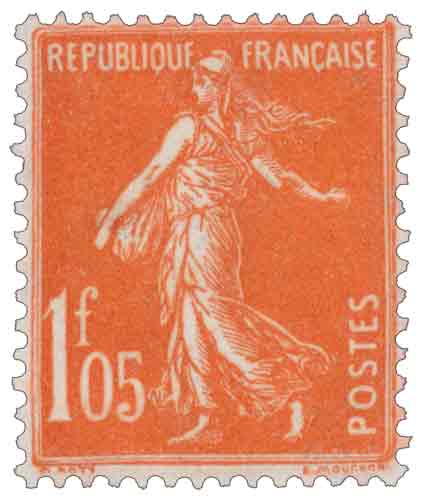 | Commentaire | Semeuse camée. Voir la vidéo "Histoires de timbres" En savoir plus sur Wikipédia : semeuse camée Émis en juillet 1925 et retiré de la vente en mai 1926, ce timbre de 1 f 05 vermillon appartient à la série des Semeuse fond plein à inscriptions grasses, utilisée à une période de forte instabilité tarifaire. Les inscriptions épaissies distinguent ce type des émissions antérieures, adaptées ici aux valeurs supérieures alors très utilisées pour les affranchissements lourds ou recommandés.