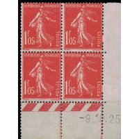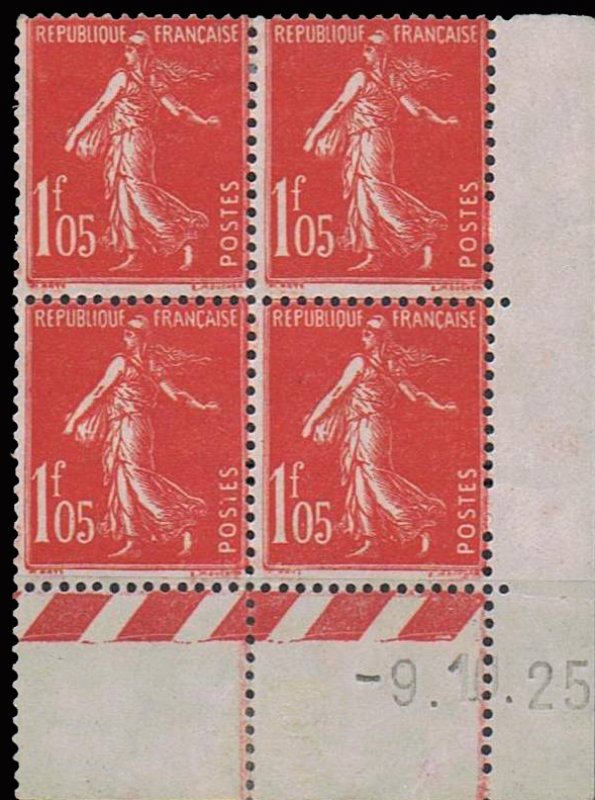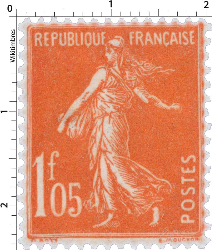 | Commentaire | Semeuse camée. Voir la vidéo "Histoires de timbres" En savoir plus sur Wikipédia : semeuse camée Émis en juillet 1925 et retiré de la vente en mai 1926, ce timbre de 1 f 05 vermillon appartient à la série des Semeuse fond plein à inscriptions grasses, utilisée à une période de forte instabilité tarifaire. Les inscriptions épaissies distinguent ce type des émissions antérieures, adaptées ici aux valeurs supérieures alors très utilisées pour les affranchissements lourds ou recommandés.