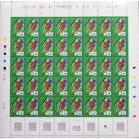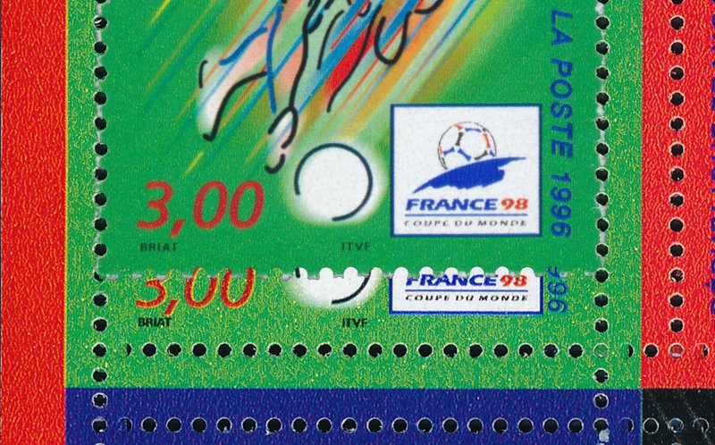 | Commentaire | Ce timbre a été repris avec le même millésime dans le BKautre-1998-1. Il se distingue de celui imprimé sur le BKautre par la longueur des noms du dessinateur et de l'imprimeur : - timbres de feuilles les noms sont longs : Briat 2,2 mm, ITVF 1,7 mm. - timbres du bloc les noms sont courts : Briat 2 mm, ITVF 1,5 mm. De plus l'espacement entre le E final de Française et le L de la poste est également différent : - Timbres de feuille : 0,9 mm - Timbres du bloc : 1,0 mm. |