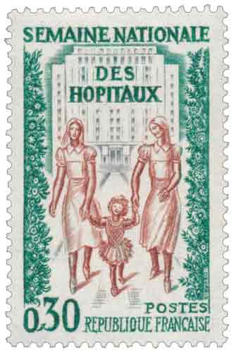 | Commentaire | Émis en 1962 à l’occasion de la Semaine nationale des hôpitaux, ce timbre traduit l’attention portée par l’administration postale française à l’évolution des services publics de santé au début des années 1960, dans un contexte de modernisation rapide des structures hospitalières et d’extension de la protection sociale. Longtemps associés à l’assistance et à la prise en charge des populations les plus démunies, les hôpitaux deviennent alors des pôles centraux de la vie sanitaire nationale, concentrant des techniques de diagnostic et de soins de plus en plus spécialisées et mobilisant un personnel nombreux et qualifié. La Semaine nationale des hôpitaux, organisée sous l’impulsion de la Fédération hospitalière de France, vise à mieux faire connaître ce rôle élargi et à modifier la perception du public face à des institutions désormais au cœur des politiques de santé et de prévention. Le timbre s’inscrit ainsi dans une démarche pédagogique et civique, illustrant la place croissante de l’hôpital moderne comme aboutissement naturel des progrès médicaux et comme pilier de la solidarité nationale dans la France de l’après-guerre. Article rédigé pour WikiTimbre |