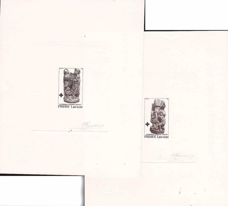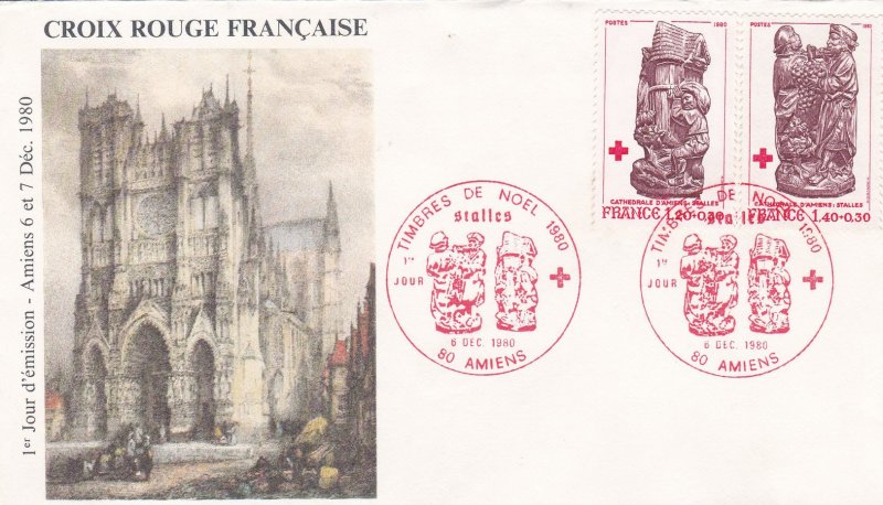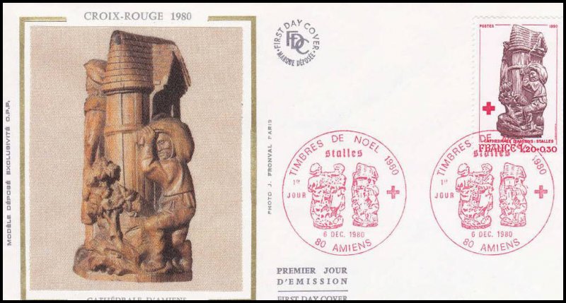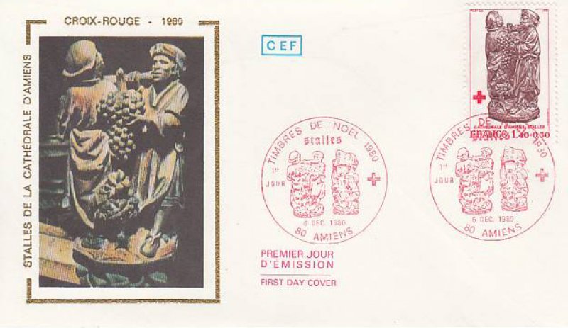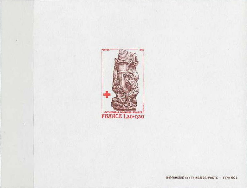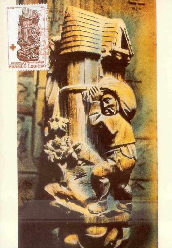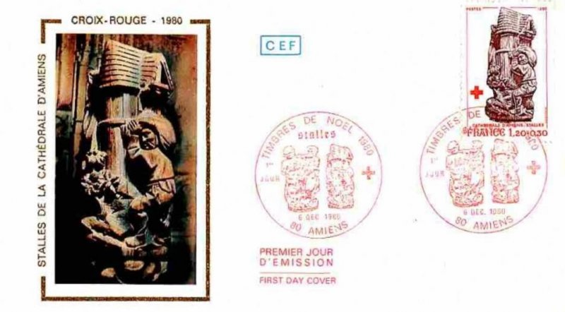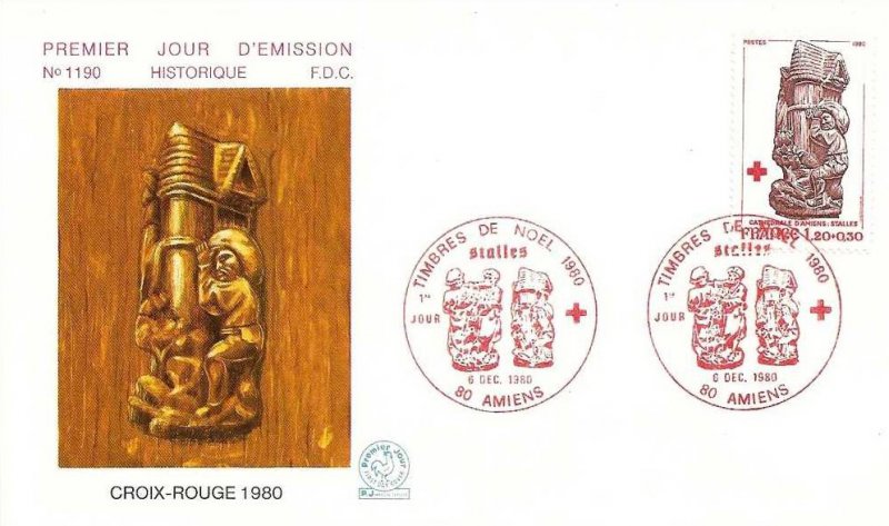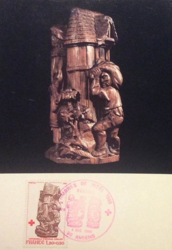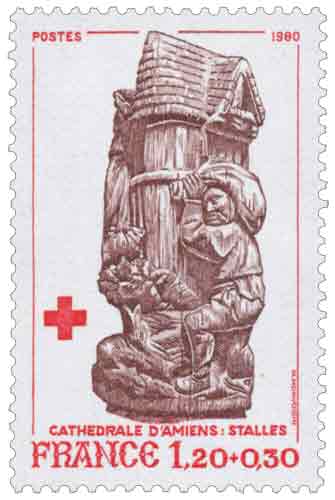 | Commentaire | Ce timbre est grevé d'une surtaxe au profit de la Croix Rouge française. Les timbres émis sous forme de carnets sont dentelés 12 demi x 13 Origine : entre 1508 et 1522, le chapitre d'Amiens commanda pour le chœur un vaste ensemble de stalles à sculpter dans le bois, 62 sur la rangée du haut pour les chanoines, 48 sur la marche inférieure pour les desservants des chapelles et pour les chantres. Stalles en chêne massif avec assemblages réalisés par tenons et mortaises. |