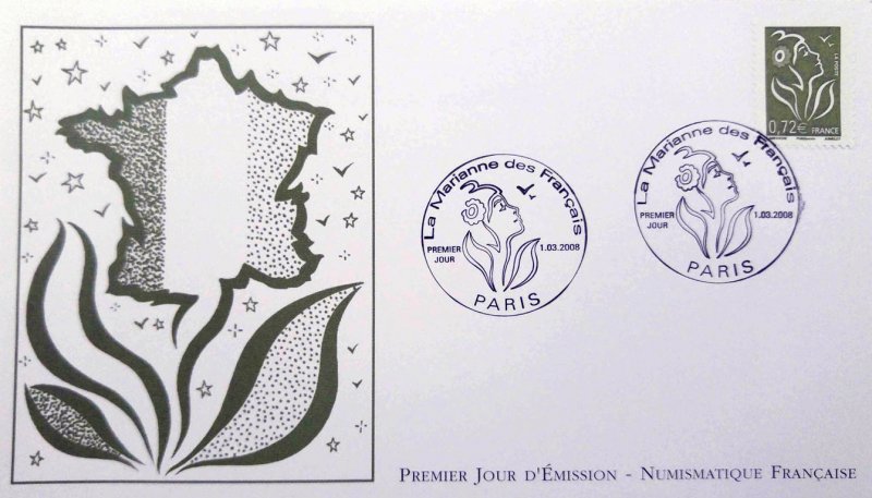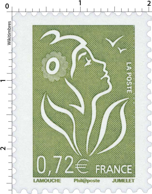 | Commentaire | Marianne des Français. Un cachet premier jour est disponible le 1er janvier lors de la manifestation de la Fête du timbre de Paris. Le cachet premier jour de Lamouche reprenant le même profil est celui utilisé lors de la première émission en janvier 2005. |