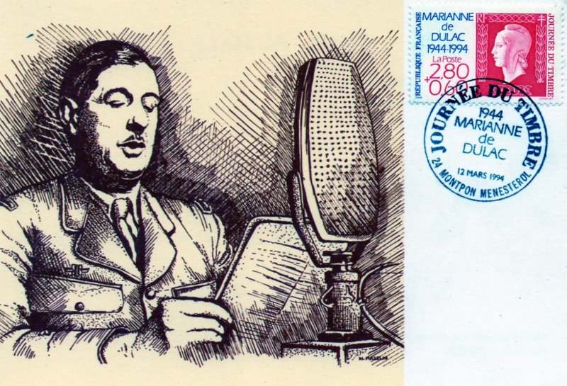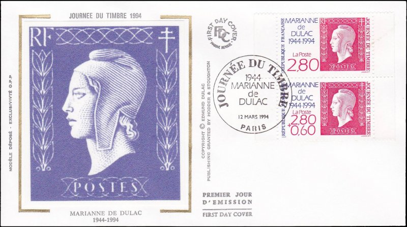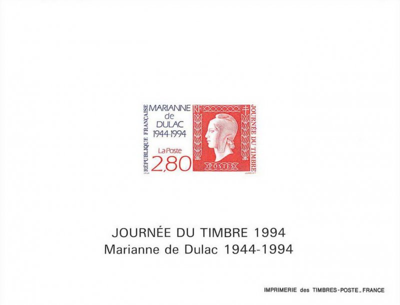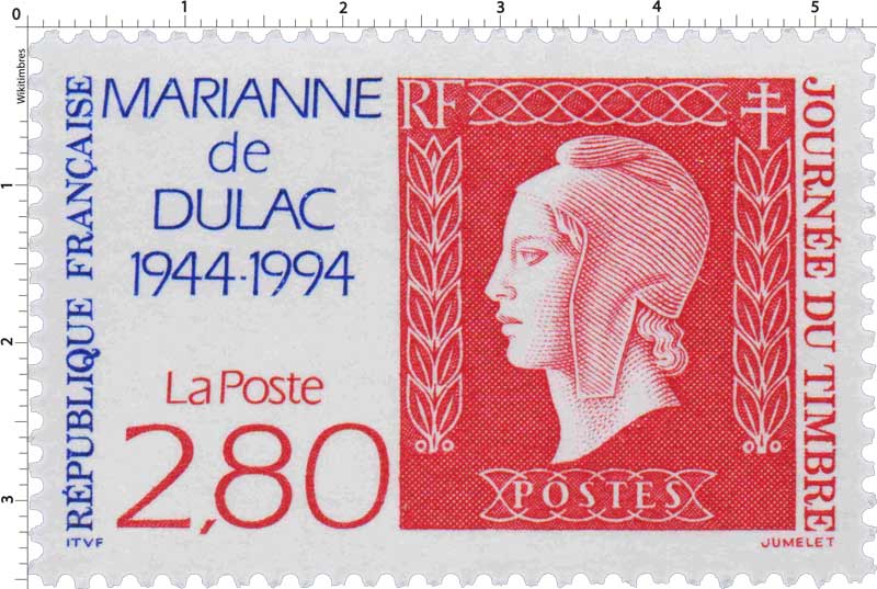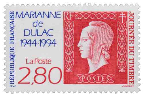 | Description | Journée du Timbre 1994. Cinquantenaire de la Marianne de Dulac (1944-1994). Timbre sur timbre, sans surtaxe |