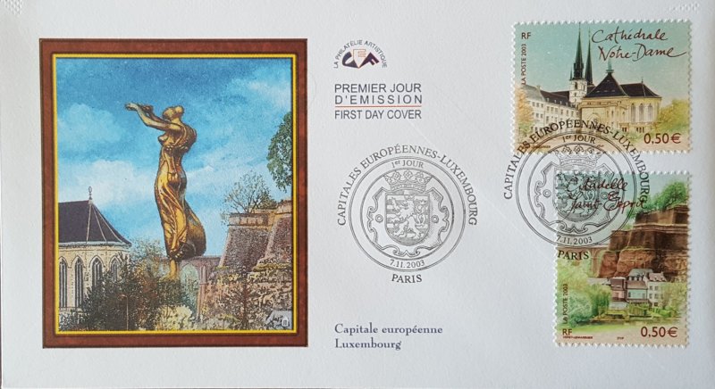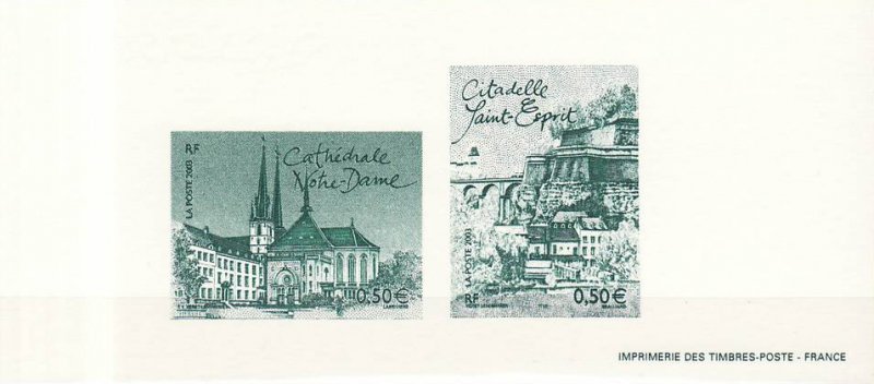 | Commentaire | Description synthétique du visuel du bloc Après Rome en 2002, la série Capitales Européennes se poursuit avec la ville de Luxembourg. Les quatre visuels des timbres représentés sur le bloc sont : la citadelle Saint-Esprit, la cathédrale Notre-Dame, le palais grand-ducal et le pont Adolphe. Des illustrations complètent le bloc. Émis uniquement en feuillet |