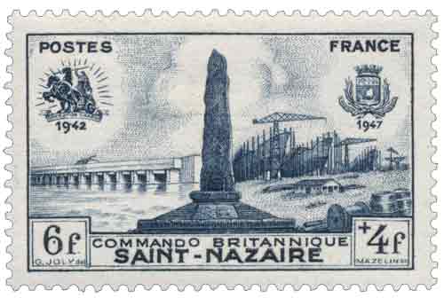 | Commentaire | En savoir plus sur : Le Patrimoine du timbre poste français Émis en France en 1947, ce timbre gommé commémoratif rend hommage au commando britannique ayant mené l’attaque de la base sous-marine allemande de Saint-Nazaire le 28 mars 1942, cinq ans après les faits et à l’occasion de l’inauguration du monument commémoratif local, et s’inscrit parmi les timbres commémoratifs de l’après-guerre dédiés aux événements de la Seconde Guerre mondiale ; dessiné par Gustave Joly et gravé par Charles Mazelin, il est imprimé en taille-douce rotative et destiné à l’affranchissement courant, avec un usage prévu pour la lettre simple du régime intérieur ainsi que pour la carte postale à destination de l’étranger, tout en portant une surtaxe au profit de l’Entraide Française, pratique caractéristique de plusieurs émissions de la période ; la place du timbre dans la production de 1947 est celle d’une émission ponctuelle liée à un fait militaire précis et localisé, sans prolongement en série, et l’iconographie se concentre sur l’évocation directe de l’opération, dont une information historiquement établie rappelle qu’elle visait à neutraliser les installations portuaires de Saint-Nazaire utilisées par la Kriegsmarine. |
