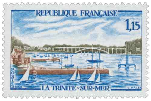 | Commentaire | Le timbre français émis en février 1969 consacré à La Trinité-sur-Mer illustre le port de plaisance de cette commune du Morbihan devenue, au cours du XXᵉ siècle, l’un des hauts lieux de la navigation de loisir et de la voile de compétition sur la façade atlantique, s’inscrivant dans la série des Sites et monuments qui met en valeur des paysages et infrastructures emblématiques du territoire français ; la figurine représente un estuaire breton typique, protégé et naturellement abrité, dont l’aménagement progressif a permis l’accueil de nombreux yachts et fait de La Trinité-sur-Mer un port d’escale et de refuge reconnu, tandis que l’usage postal correspond aux affranchissements intérieurs en vigueur à la date d’émission pour une valeur faciale élevée reflétant l’augmentation des tarifs à la fin des années 1960 ; dessiné et gravé par Claude Haley, le timbre est imprimé en taille-douce, technique qui met en relief les lignes du port, du plan d’eau et du pont de Kérisper, symbole du développement maritime et touristique de la commune, la vente anticipée organisée sur place soulignant le lien étroit entre le sujet représenté et son ancrage local. Article rédigé pour WikiTimbres |