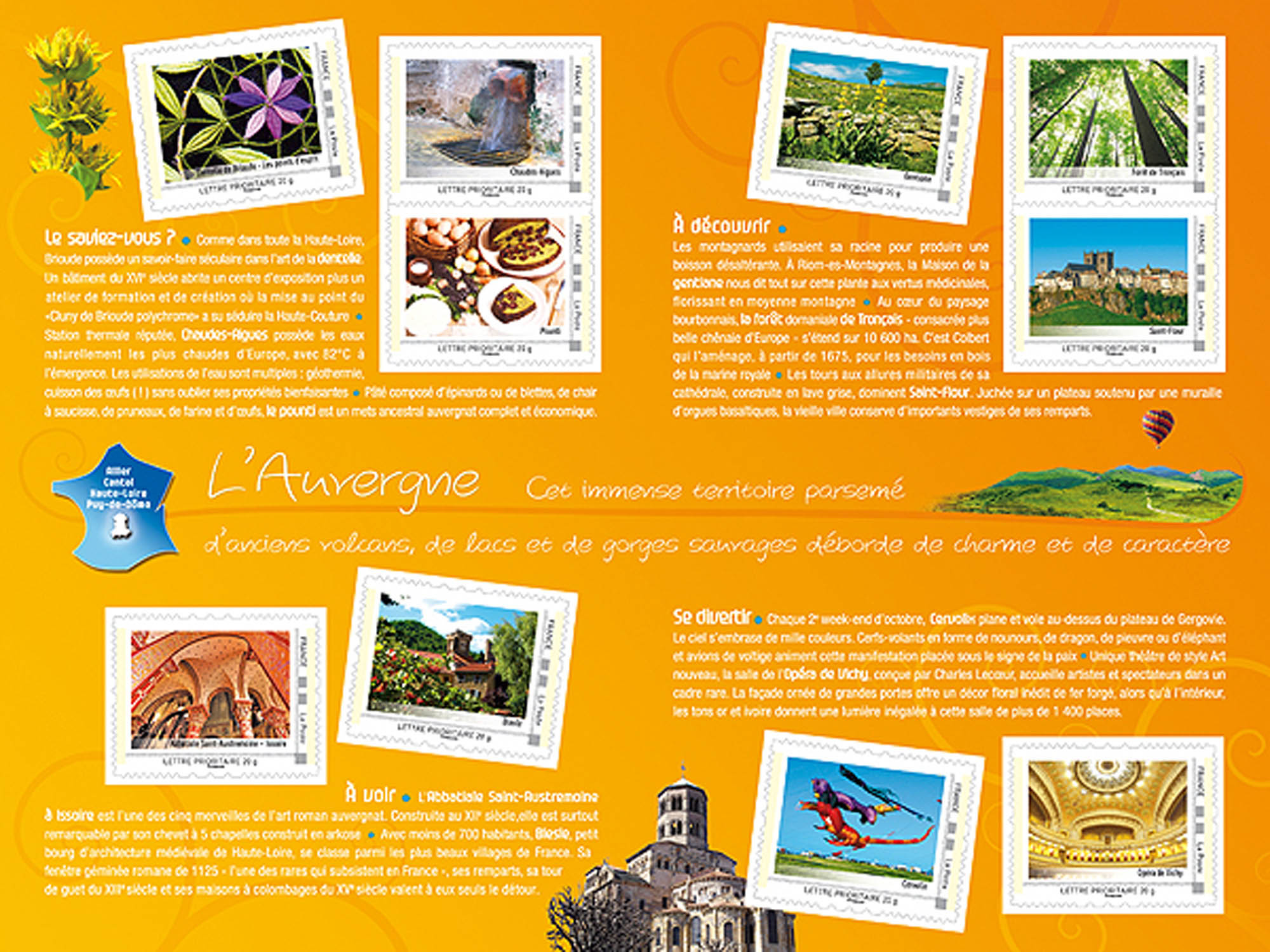 | Commentaire | Dentelle de Brioude - Les points d’esprit, Chaudes Aigues, Pounti, Abbatiale Sainte – Austremoin – Issoire, Blesle, Gentiane, Forêt de Tronçais, Saint-Flour, Cervolix, Opéra de Vichy |