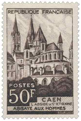 | Commentaire | Visuel : l'abside de l´église Saint Etienne de Caen. L'abbaye aux Hommes, ou abbaye Saint-Étienne de Caen, est une des deux grandes abbayes, avec l'abbaye aux Dames, fondées par Guillaume le Conquérant (1027/28-1087, roi d'Angleterre de déc.1066 à sept.1087). Mis en vente en France à partir du 22 décembre 1951 à Caen, puis du 24 décembre dans l’ensemble des bureaux du territoire, le timbre-poste touristique de la série courante représentant l’Abbaye aux Hommes s’inscrit dans la politique philatélique de valorisation des grands monuments historiques français intégrés à l’usage postal quotidien. Dessiné et gravé en taille-douce par Gabriel-Antoine Barlangue, ce timbre vertical de 50 francs met en évidence l’abside de l’église Saint-Étienne, élément emblématique d’un ensemble fondé au XIᵉ siècle par Guillaume le Conquérant et consacré en 1077. L’iconographie souligne la puissance architecturale du premier art roman normand, enrichi d’apports gothiques ultérieurs, et rappelle le rôle central de l’abbaye dans l’histoire de Caen, notamment comme lieu de sépulture de Guillaume en 1087. Épargnée par les destructions majeures de la Seconde Guerre mondiale, l’abbaye devient, au début des années 1950, un symbole patrimonial fort pour une ville en reconstruction, ce qui explique son choix pour une valeur faciale élevée destinée notamment à l’affranchissement recommandé, associant ainsi fonction postale et diffusion de l’héritage monumental de la France.