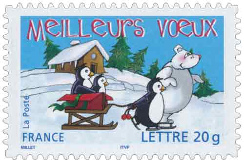 | Description | Meilleurs vœux. Ours blanc et pingouins. Émis en carnet. 2 bandes de phosphore. |