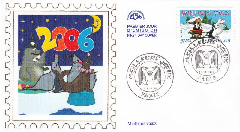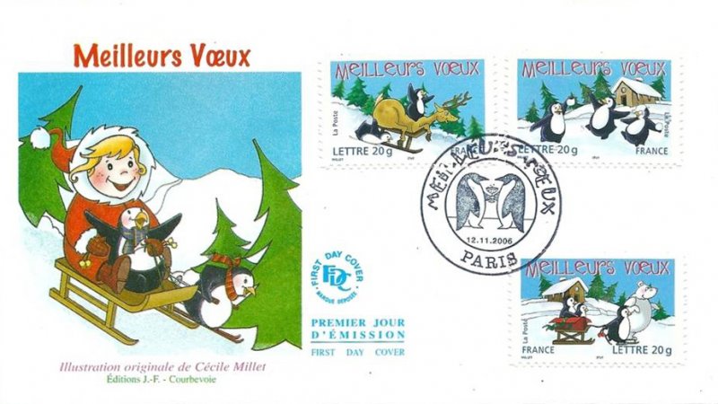 | Description | Meilleurs vœux. Ours blanc et pingouins. Émis en carnet. 2 bandes de phosphore. |