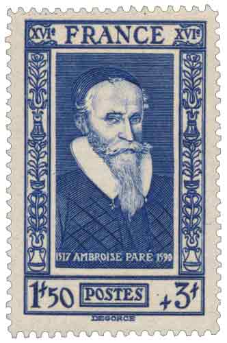 Émis en octobre 1943, le timbre Ambroise Paré rend hommage au père de la chirurgie moderne, figure majeure de la médecine française de la Renaissance. Chirurgien des champs de bataille, Ambroise Paré révolutionne les pratiques opératoires en remplaçant la cautérisation par la ligature des artères, sauvant ainsi d’innombrables blessés. |