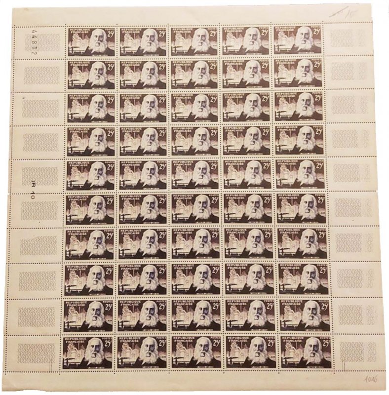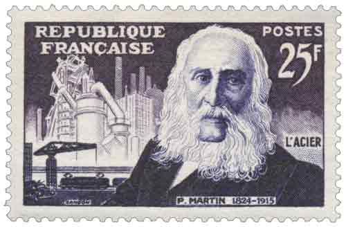 | Commentaire | En savoir plus sur Wikipédia : Histoire de la production de l'acier En savoir plus sur Wikipédia : Pierre-Émile Martin Émis en 1955 dans la série de six timbres-poste français consacrée aux inventeurs et savants du XIXᵉ siècle, le timbre dédié à Pierre-Émile Martin met en lumière une figure majeure de la sidérurgie française, cette figurine gravée en taille-douce et imprimée en format horizontal s’inscrivant dans une émission cohérente par son graphisme et par son propos historique, le timbre évoquant l’ingénieur des Mines qui mit au point en 1865 le procédé d’élaboration de l’acier dit « procédé Martin », fondé sur l’affinage de la fonte et la refusion de déchets d’acier dans un four à sole, technique issue des travaux de Siemens et adaptée à une production industrielle de grande ampleur, innovation déterminante pour le développement des chemins de fer, des constructions métalliques et de l’industrialisation lourde, l’usage postal correspondant à l’affranchissement de la carte postale pour l’étranger, traduisant une diffusion courante, tandis que la place de ce timbre dans la série souligne le rôle central de la métallurgie dans les transformations économiques du XIXᵉ siècle en France, une information historiquement établie étant qu’à la fin du XIXᵉ siècle près de la moitié de la production mondiale d’acier était réalisée selon le procédé Martin. |