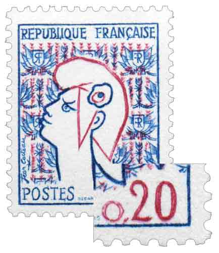 | Commentaire | Type I. Différence du zéro, et pas de corne sur le 2 voir POSTE-1961-46 Voir la vidéo "Histoires de timbres" En savoir plus sur Wikipédia : Jean Cocteau La Marianne de Cocteau marque une étape singulière dans l’histoire des timbres d’usage courant français en confiant à Jean Cocteau le dessin de l’allégorie républicaine, interprétée dans un style linéaire et épuré, immédiatement reconnaissable, tandis que la gravure est assurée par Albert Decaris. Émise en 1961, cette figurine de petit format inaugure une nouvelle génération de timbres courants imprimés en taille-douce rotative polychrome, conciliant exigence artistique et contraintes de grande diffusion. Le visage de Marianne, aux traits stylisés et au regard calme, s’inscrit dans la tradition iconographique républicaine tout en s’en détachant par une modernité graphique assumée, reflet de l’esthétique de Cocteau. Destinée aux affranchissements quotidiens, la valeur de 0,20 F répond aux besoins courants de la carte postale intérieure et des imprimés pour l’étranger, assurant à cette Marianne une circulation massive et durable, confirmée par une longévité exceptionnelle jusqu’en 1967. Par son format réduit, sa polychromie en taille-douce et son statut d’usage courant, cette émission constitue une référence technique et esthétique majeure du début des années 1960 dans la philatélie française. Article rédigé pour WikiTimbres.