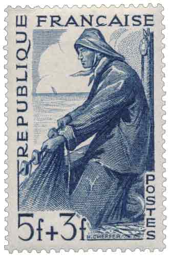 | Commentaire | Ce timbre gommé français émis en 1949 appartient à la série des Métiers et met en scène la figure du pêcheur, profession emblématique des régions littorales et de l’économie maritime française dans le contexte de la reconstruction de l’après-guerre ; conçu comme une émission à caractère social et caritatif, il associe une valeur postale utilitaire à une surtaxe au profit de la Croix-Rouge française, illustrant la mobilisation nationale autour des œuvres de solidarité, tandis que son usage postal correspond à l’affranchissement des imprimés du régime intérieur au premier échelon de poids ; dessiné et gravé par Henry Cheffer, ce timbre vertical est imprimé en taille-douce rotative, technique privilégiée pour les émissions de prestige de la période, offrant une composition expressive et dynamique du geste du pêcheur au travail, renforcée par une teinte bleue évocatrice du monde marin ; émis en février 1949 et retiré rapidement de la vente, il s’inscrit dans une série cohérente consacrée aux métiers essentiels, témoignant de la volonté de la philatélie française de valoriser le travail humain tout en soutenant des causes d’intérêt général. |