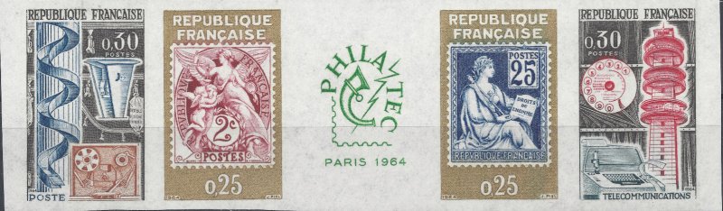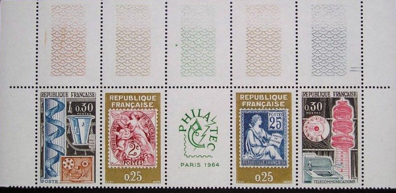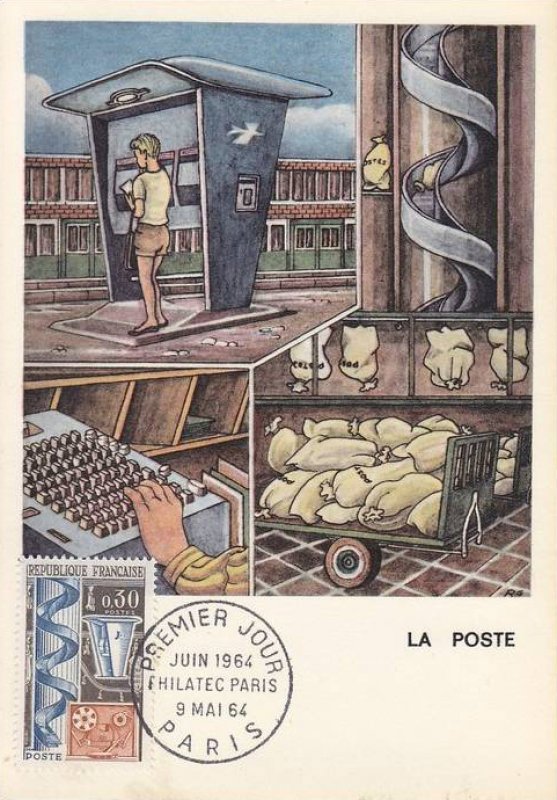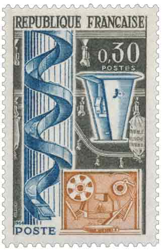 | Commentaire | À Paris en 1964, sous la verrière du Grand Palais, s’ouvre un événement un peu fou et terriblement moderne pour son époque : PHILATEC. Entre deux colonnes monumentales et quelques expositions internationales, le but est clair : montrer que les timbres racontent bien plus qu’un prix d’affranchissement... ils racontent notre monde qui bouge. Concrètement, le Ministère des Postes et Télécommunications lance pour l'occasion une série de quatre timbres inséparables, célébrant à la fois le passé tendre de la philatélie — avec les mythiques « types Blanc et Mouchon » de 1900 — et l’incroyable essor de la technique postale. Sérieusement, tu savais qu’à l’époque on utilisait des glissières hélicoïdales pour faire voyager les sacs de courrier ? Et même des convoyeurs aériens façon mini-montagnes russes pour paquets pressés ? Mais PHILATEC, ce n’est pas seulement une ode aux vieux cachets et aux petits bonhommes en képi. C’est aussi une plongée dans la révolution silencieuse des télécommunications. Télex, tours hertziennes, dérouleurs de bandes magnétiques... Le futur débarquait, parfois même en charentaises. L’idée, un peu utopique mais touchante, c’était qu’aucune distance ne soit plus jamais un obstacle entre deux êtres (tu parles, les textos n’existaient pas encore...). Petit clin d’œil : le logo de PHILATEC mélange un huchet de maître de poste (coucou, Moyen Âge !) et un éclair, symbole du progrès électrique. Une sorte de handshake entre tradition et futurisme. Alors oui, en 1964, on croyait dur comme fer que technique et poésie pouvaient faire bon ménage. Et, quelque part, cette douce croyance plane encore au-dessus de nos têtes connectées. WikiTimbres |