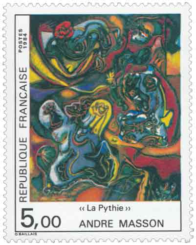 | Commentaire | Ce timbre s’inscrit dans la politique culturelle et patrimoniale de l’administration postale française du début des années 1980, qui accorde une place importante aux grandes figures de l’art moderne à travers la série dite du « musée imaginaire ». Il reproduit une œuvre majeure d’André Masson, La Pythie, pastel réalisé en 1943 et conservé au Musée national d’Art moderne, au Centre Georges Pompidou. Le choix de cette œuvre renvoie directement à la période américaine de l’artiste, marquée par l’exil et par une intensification de sa réflexion sur le mythe, la violence et les forces cosmiques. La référence à la Pythie de Delphes s’inscrit dans une exploration des figures oraculaires et des puissances archaïques, thèmes récurrents dans l’œuvre de Masson après le traumatisme de la Première Guerre mondiale et face aux bouleversements du XXᵉ siècle. Ce timbre met ainsi en avant un artiste qui, sans se rattacher durablement à une école unique, a traversé le cubisme, le surréalisme et l’abstraction tout en conservant une démarche profondément personnelle, fondée sur l’automatisme, la métamorphose et l’énergie du geste. Par cette émission de 1984, la poste française souligne l’importance de la création artistique contemporaine dans le patrimoine national et affirme le rôle du timbre comme vecteur de diffusion culturelle, capable de relier l’histoire de l’art moderne à un large public, dans le cadre des timbres de France consacrés aux grandes œuvres et aux artistes majeurs du XXᵉ siècle. Article rédigé pour WikiTimbres |