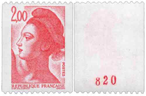 | Commentaire | Roulette de 1000 timbres avec numéros en rouge au dos tous les 10 timbres. Le premier numéro est 000, le dernier est 999. Il existe sur ce timbre de forts décalages des bandes phosphorescentes, aussi bien verticalement, qu'horizontalement. |