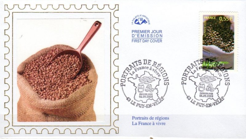 | Commentaire | 4 verticaux 26 x 40 mm 6 horizontaux 40 x 26 mm. La manifestation premier jour se déroule les 6 et 7 septembre dans plusieurs villes liées aux éléments représentés par l'émission : Aix-en-Provence, Céret, Cilaos, Dijon, Dole, Épinal, Laruns, Le Puy-en-Velay, Paris, Sabres et Thônes. Valérie Besser dessine le cachet premier jour : une carte de France dans laquelle se trouvent trois châtaignes, un pot de moutarde et des calissons. |