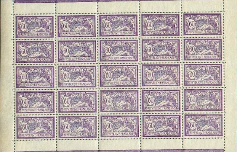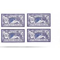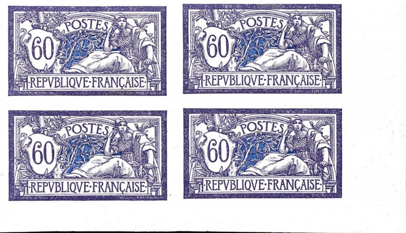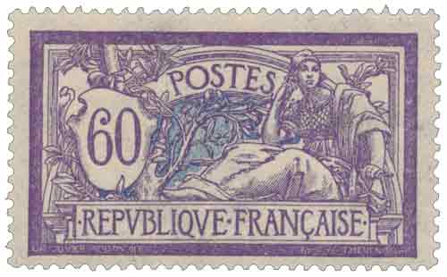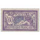 | Commentaire | Le 60 centimes Merson violet et bleu, mis en vente le 1ᵉʳ juin 1920, appartient à la dernière période d’utilisation des timbres au type Merson, une série emblématique de la IIIᵉ République. Dessiné par Luc-Olivier Merson et gravé par Auguste Thévenin, ce timbre d’usage courant illustre la transition entre les affranchissements d’avant-guerre et les nouveaux tarifs instaurés au début des années 1920. Le visuel représente la célèbre allégorie de la République assise, gardienne de la Paix, thème récurrent de la série. Fidèle au format large caractéristique du type Merson, le timbre mesure 40 × 24 mm, dentelé 13½ × 14, et est imprimé en typographie bicolore : un passage pour le violet, un pour le bleu. Cette technique, encore sensible aux décalages d’encrage, a généré de nombreuses variétés d’impression intéressantes pour les collectionneurs spécialisés. Imprimé en feuilles de 75, ce 60 c répond à l’évolution des tarifs de l’époque, notamment ceux applicables aux lettres plus lourdes et aux envois vers l’étranger. Il est retiré de la vente le 17 juin 1924, marquant la fin d’un cycle pour les grandes valeurs courantes avant l’essor généralisé des Semeuses et des séries de l’entre-deux-guerres. Le YT 144 constitue aujourd’hui un timbre essentiel pour comprendre la dernière phase d’utilisation du type Merson, tant sur le plan postal que philatélique.