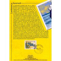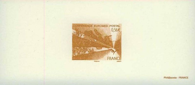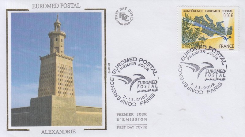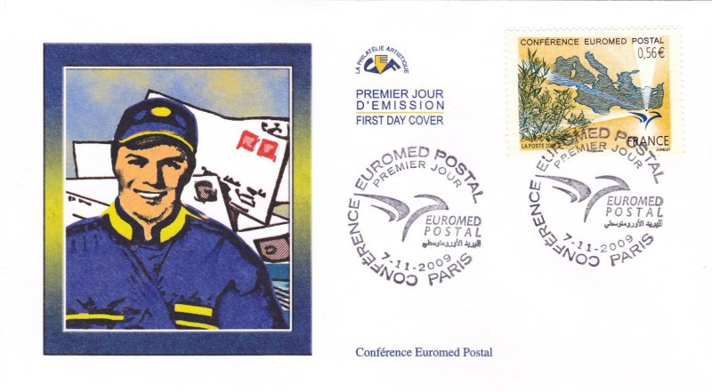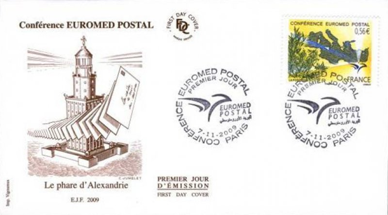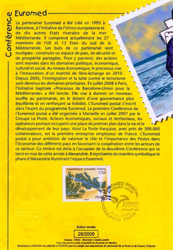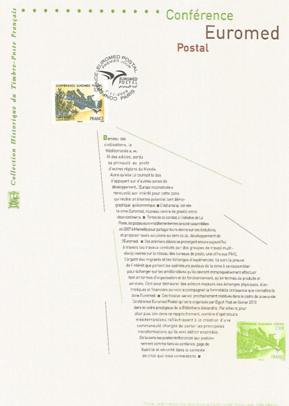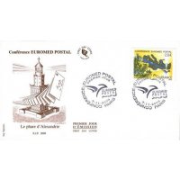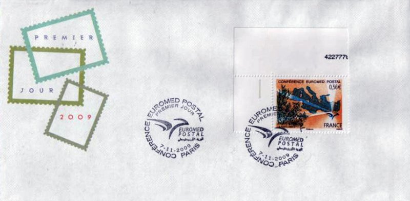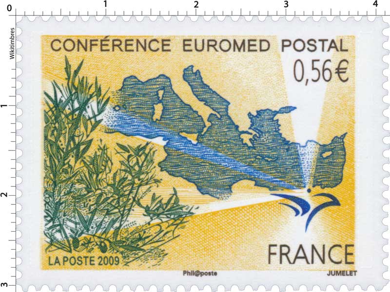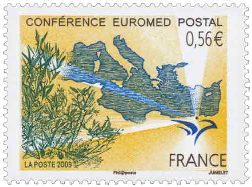 | Commentaire | La mise en vente anticipée a lieu les 7 et 8 novembre à Paris, avec un cachet premier jour reprenant le logotype de la conférence. Les opérateurs postaux du bassin méditerranéen ont décidé de renforcer leur coopération que ce soit dans le cadre de l’amélioration de la distribution des lettres et colis, la modernisation de leurs outils de production ou encore la formation des agents. Une première conférence s’est tenue à Marseille en 2007, la prochaine aura lieu à Alexandrie en Égypte en mai 2009. À cette occasion La Poste a décidé d’émettre un timbre représentant le bassin méditerranéen pour poser la dimension géographique, un olivier, symbole de la paix et de la Méditerranée, ainsi qu’une lumière partant de la ville d’Alexandrie qui rappelle de ce fait le légendaire phare. |