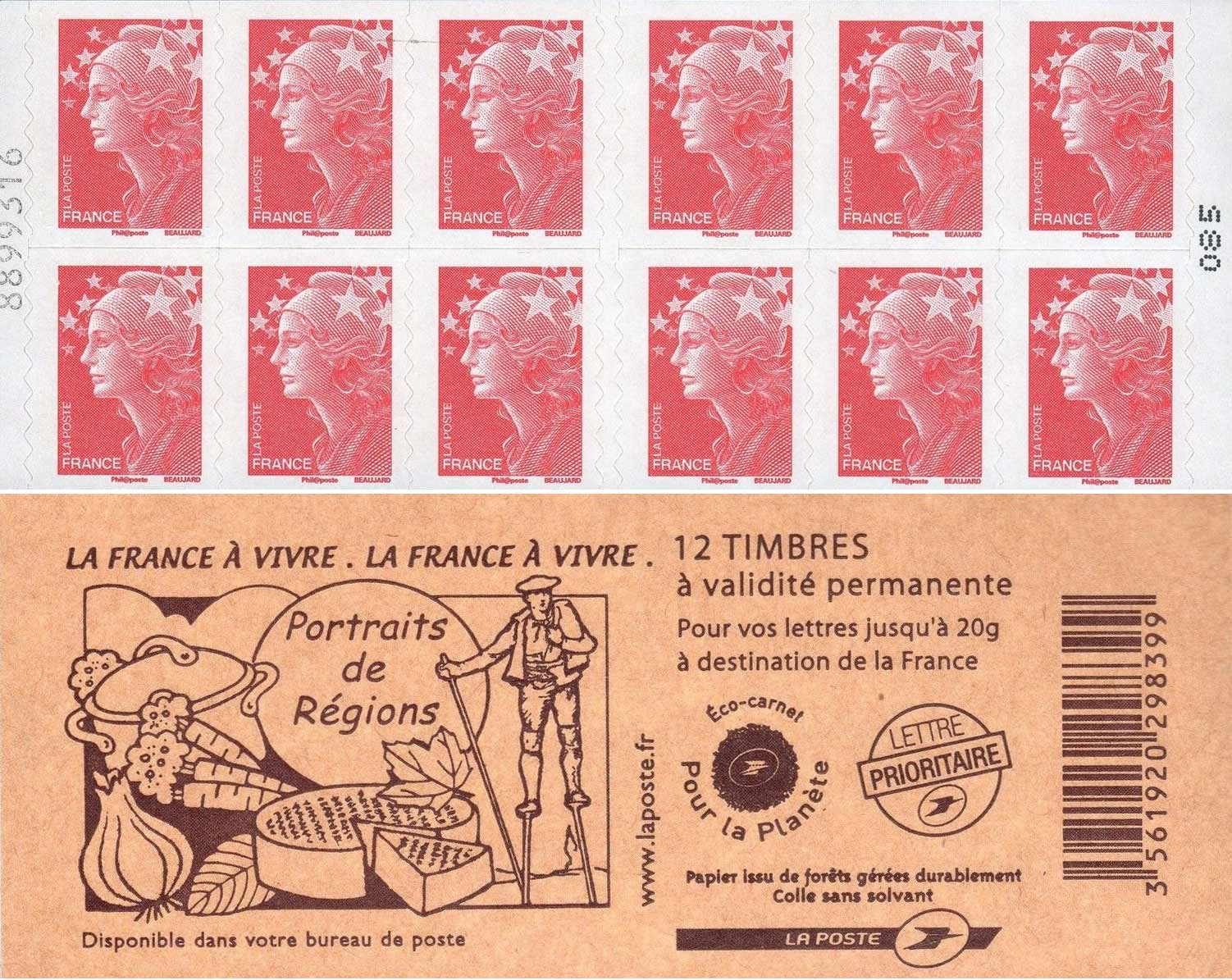 | Description | Carnet Marianne - Couv. “La France à Vivre”, Portraits de Régions n° 1212 TP autocol. - Tarif lettre France 20 g |