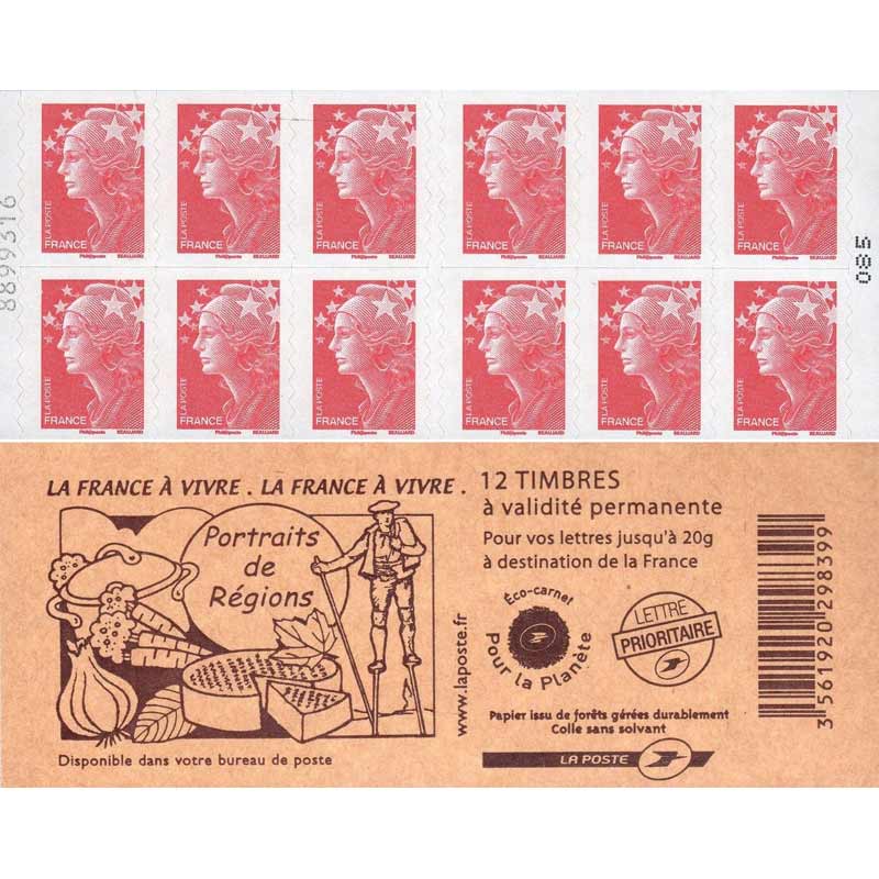 | Description | Carnet Marianne - Couv. “La France à Vivre”, Portraits de Régions n° 1212 TP autocol. - Tarif lettre France 20 g |
